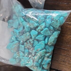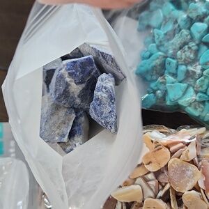 Collection of assorted craft rocks and shell chips. Includes turquoise, white, and tan colors. Perfect for jewelry making and crafts.