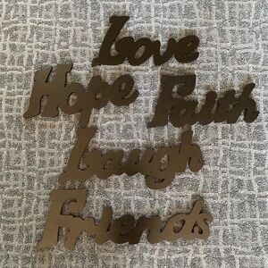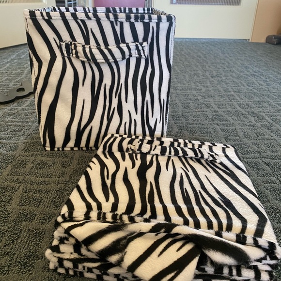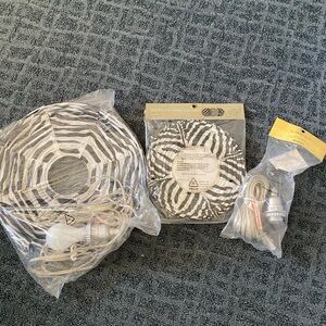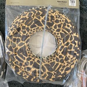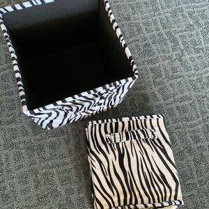 Assorted animal print and black and white room decor. Consists of: 3 - zebra print cubby boxes, 1 - zebra print round paper lantern with cord/bulb (15” diameter), 1 - 3pk animal print (zebra, cheetah, leopard) paper lanterns (10” diameter) with 1 cord, black wooden wall hangings (Faith 16”x8-1/2”, Laugh 20”x8-1/2”, Friends 23-3/4”x8-1/2”, Hope 14”x9”, Love 16”x8-1/2” approx), and 3 - vinyl wall stickers with instructions.