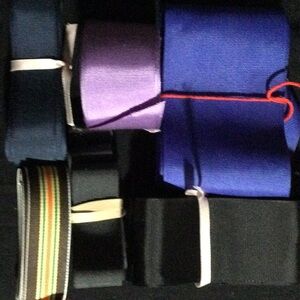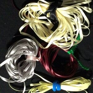 All new, assorted 120 plus yards of ribbons and trims. Includes satin and grosgrain textures. Colors include purple, pink, cream, black, red, blue and green. Great for crafts and gift wrapping. Plenty of variety in one lot. Photo 1, after cover, shows 17 yards 32 inches of 1” to 3” wide grosgrain. #2 shows 6yards 4” of 1/4 and1/2” wide narrow grosgrain ribbon and 10 yards of 1/2” wide. pink and white stripe cotton based ribbon. #3 shows 16 3/4 yards of 1” to 3” wide satin ribbons. #4 is 1/4” wide satin ribbons. Total of 49 yards and 2” in pink, white and black. Photo 5 is all 1/8 “ wide, 33 yards and 33”. Shipping weight 1 pound so may be bundled.