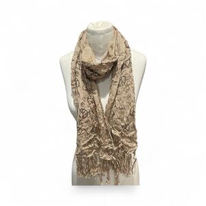 - tan summer/print peace scarf with thin tassels, thin/gauzey material