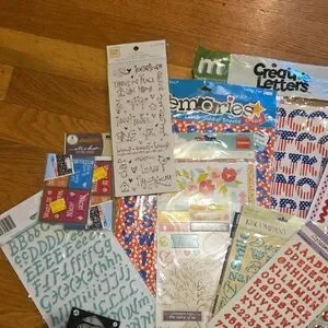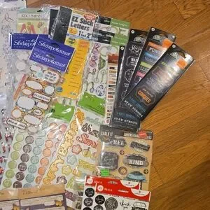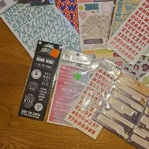 A vibrant collection of scrapbooking stickers. Includes various letters, words and phrases for creative projects.