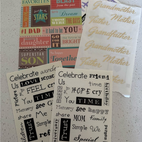 Collection of sentiment stickers in various colors and fonts. Perfect for crafts and scrapbooking.