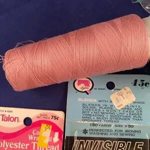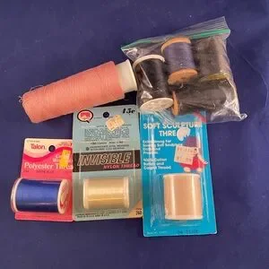 A collection of assorted sewing threads in various colors. Includes pink, blue, beige, and black threads. Perfect for sewing projects.
