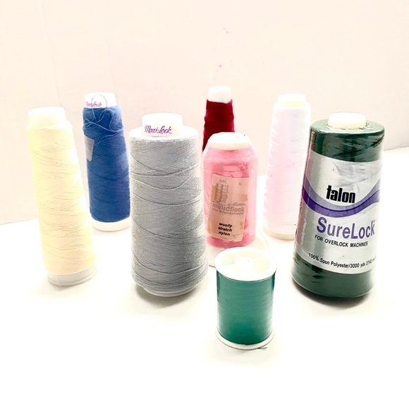 Collection of sewing thread spools in various colors including green, gray, pink, blue, burgundy, cream/beige.