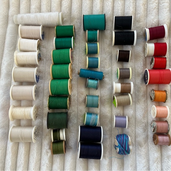 Large variety of colors in this lot of sewing thread. Some spools are vintage & wooden while others basic colors are still new and unused. Lot of 40+ spools of mixed brands. I noticed a spool of hand quilters thread, a spool of serger thread, Coats & Clark and many other brands. If you have questions feel free to ask.