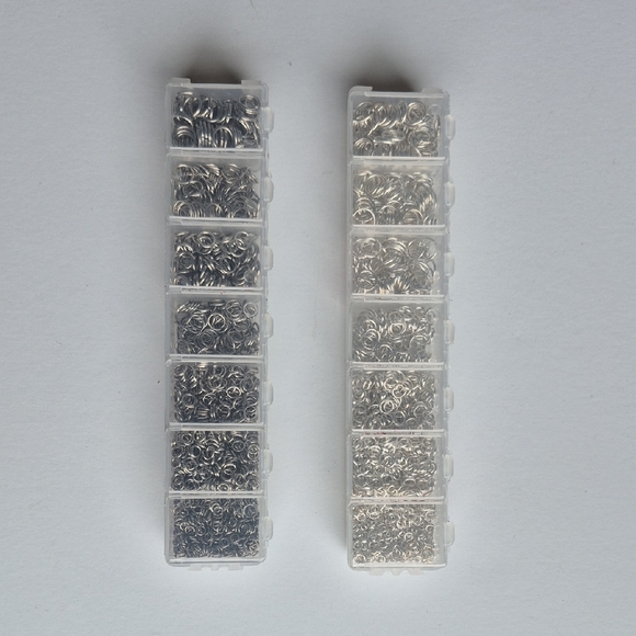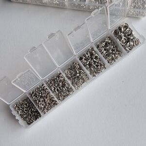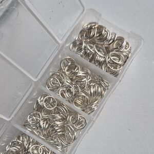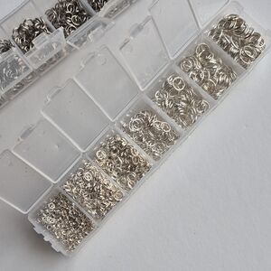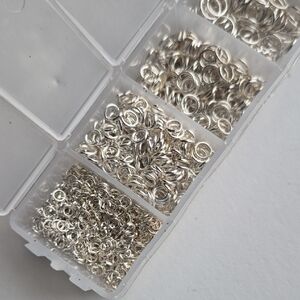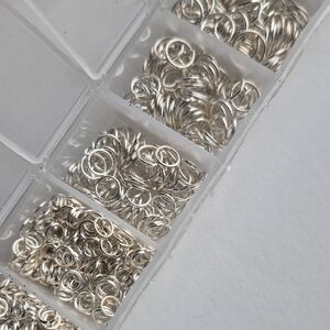 Collection of assorted silver metal jump rings. Ideal for crafting and jewelry projects. Purchased ages ago, and used a few here and there.
