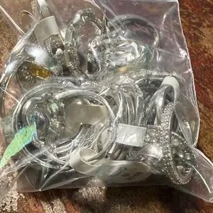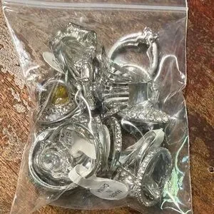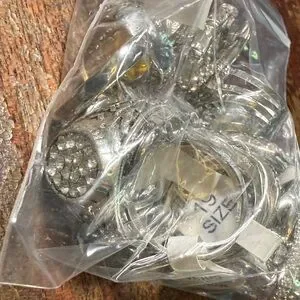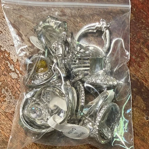 Pack of assorted silver-tone rings with clear rhinestones and faceted stones. Includes cocktail and band styles. Sparkling, multi-design set ready for wearing or display.