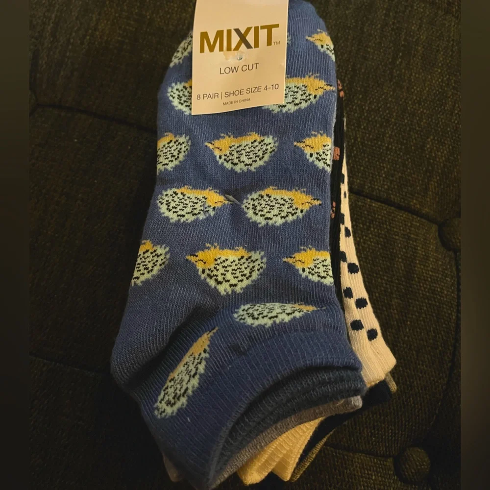 These are a brand new 8 pack of low cut socks. Fitting shoe size 4-10, these socks feature hedgehogs, flowers, polka dots, stripes, and plain gray and white socks.