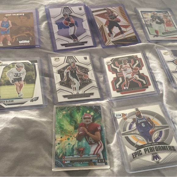 Collection of sports trading cards featuring various athletes. Includes vibrant designs and action shots.