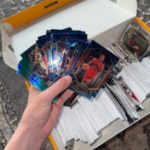A diverse collection of sports trading cards featuring various athletes. Includes cards with vibrant designs and colors.