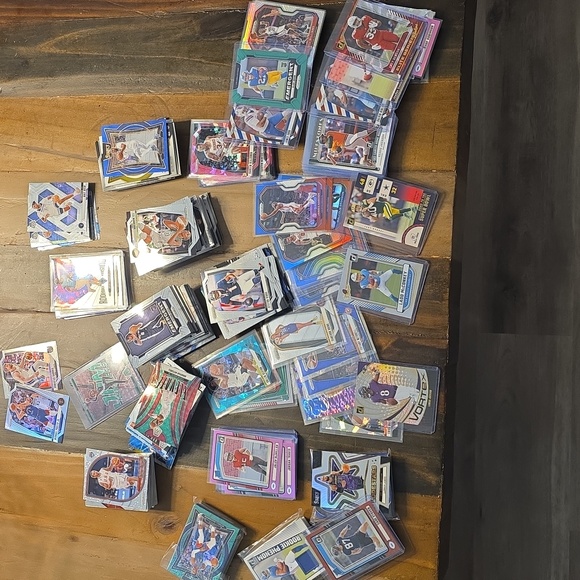 A diverse collection of sports trading cards featuring various athletes. Includes cards with vibrant designs and holographic elements.