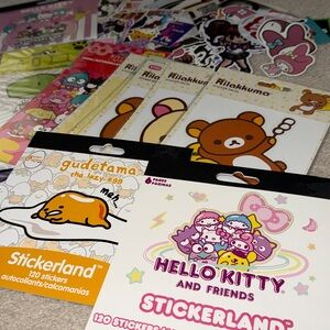 Mixed sheets and loose stickers featuring kawaii characters, florals, sweets, and icons. Bright pinks, whites, blacks and purple accents. Great for planners, scrapbooks, and decorating personal items. Ready to use and mix-and-match.
