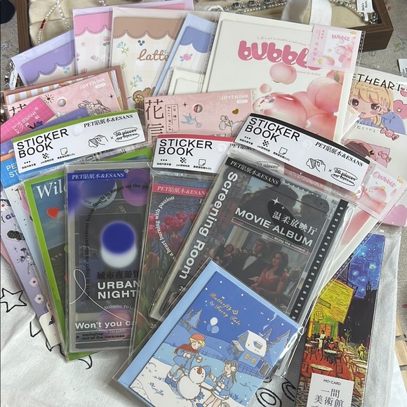 Colorful collection of sticker books and stationery items. Perfect for crafting and journaling.