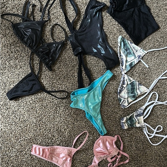A collection of stylish dance wear/Exotic wear in various colors. Includes black, teal, pink, and multicolor pieces. Perfect for mix and match.