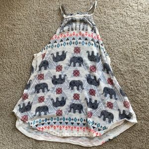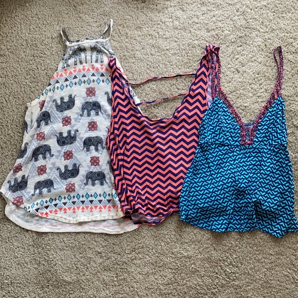 3 tank tops of various brands (shown in pictures), all fit a size small. First one is a high neck XS tank with elephant design and a knit fabric. May have some small snags. Second one is a size S, cropped, with cute strappy back. Third one is also cropped and lower cut, size S.