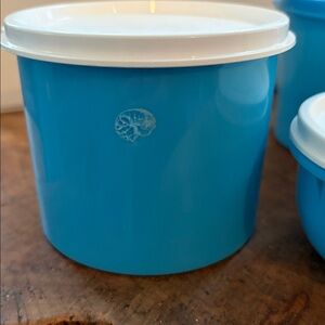 Set of three blue storage containers with lids. Perfect for kitchen organization. Barely used. One blemish on white lidded larger container, see photos.