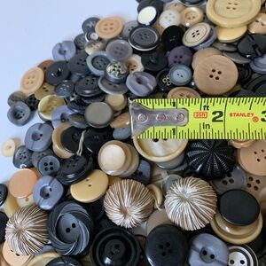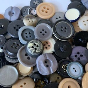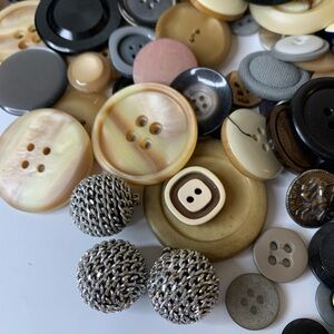 A diverse collection of vintage buttons in various colors including black, cream, and tan. Perfect for crafting and sewing projects. Mid century and military buttons. Resin metal and shell.