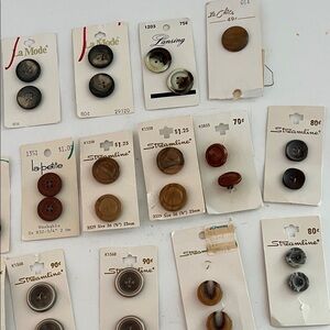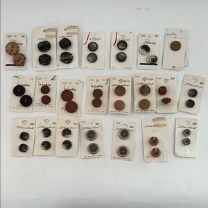 A collection of assorted buttons in various colors and styles. Perfect for sewing or crafting projects. Unused buttons on original cards. 22 cards includes wooden and wood-look plus tortoise shell look buttons,