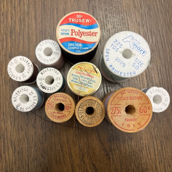 This lot of 11 vintage sewing thread spools includes various brands, sizes, and colors, making it a unique and eclectic addition to any sewing collection. The multicolor palette adds a vibrant touch to these classic spools, making them a fun and nostalgic piece for sewing enthusiasts or collectors.