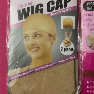 Set of three wig caps in beige and black. Includes deluxe and stocking styles.
