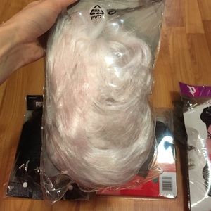 All in original netting and packaging. The princess leia and curly wigs have never been worn and the bettie page and red curly one have been worn once and are in excellent condition. The white/blonde wig needs a little TLC but can still be used. Each of these wigs cost at least $15 individually so it is a great value!