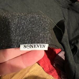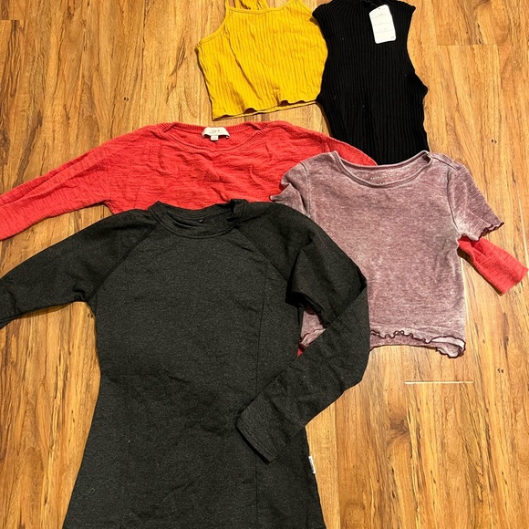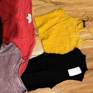 A collection of stylish women's tops in various colors. Includes a yellow tank, black sleeveless top, red long-sleeve, purple short-sleeve, and black long-sleeve dress. American eagle, H&M, SHEIN, etc