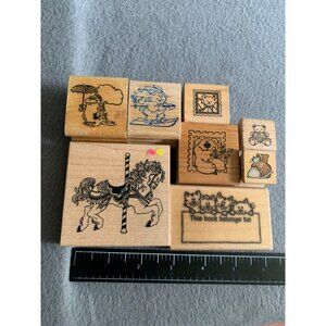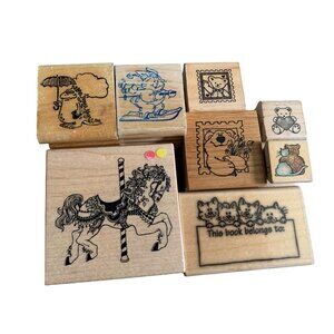 This assortment of wooden rubber stamps adds a touch of whimsy to any crafting or scrapbooking project. Stamp away with cute animals, a carousel horse, and more.