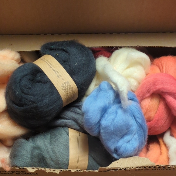 Colorful wool roving bundle. Includes black, white, blue, and orange shades. Perfect for crafting and felting projects.