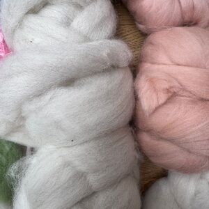 Set of wool roving in various colors. Includes white, pink, blue, green, red, and black. for spinning or crafting