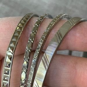 One price gets you all bracelets shown. These are from an estate sale. These four assorted metal bangles have different patterns. The bracelets are not marked, but they are not attracted by a magnet, so it's possible there is real silver involved. Approx. size is 2 3/4 inches diameter.