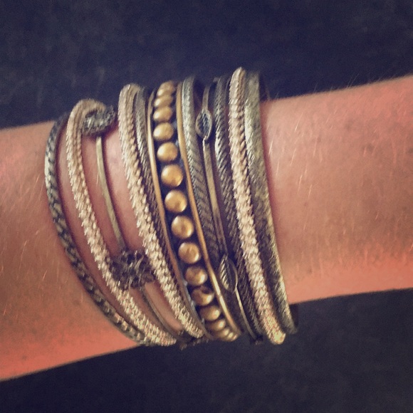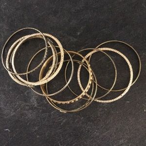 Mix of sparkle, bronze and gold bangles. Little details of leaves and designs.