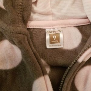 One Carters fleece, brown bear hooded vest enough pink polka dots, zip up. Like new condition size 9 months. One Kushie baby waterproof cloth diaper all in one, size 3-6 months, never used.