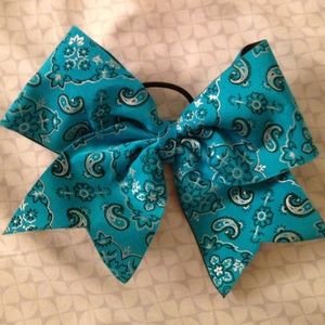 -pink cheer bow with fierce metallic blue lettering -red and white zebra striped cheer bow -pink and black cow print cheer bow -black and metallic silver zebra striped cheer bow -blue bandana cheer bow -purple sparkle velvet cheer bow -red and black cheetah print cheer bow -sparkly black, red and orange cheetah print cheer bow