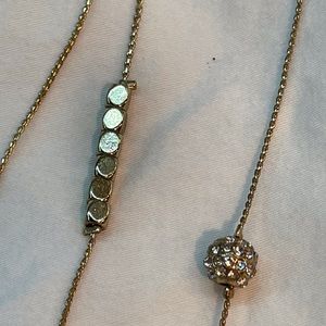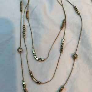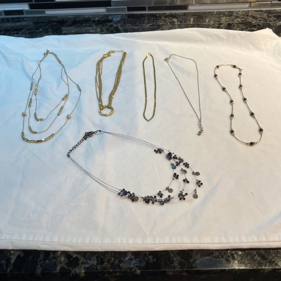 Assorted necklaces, gold plated, chrome, silver plated, gold and black jade beads. Approximately 18”. All are included in price.