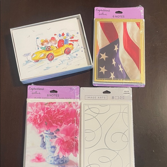 Assorted note card sets with vibrant designs. Includes patriotic, floral, and artistic themes. Perfect for any occasion. The Kristin Elliot pack has 6 cards and envelops not 8