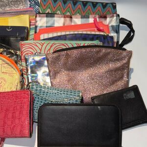 A vibrant collection of clutches and wallets in various colors and patterns. Perfect for adding a pop of color to any outfit. 15 separate small bags and 5 wallets.