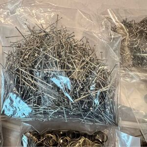 A collection of jewelry making supplies including hooks, rings, and pins. Features silver and gold tones.