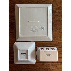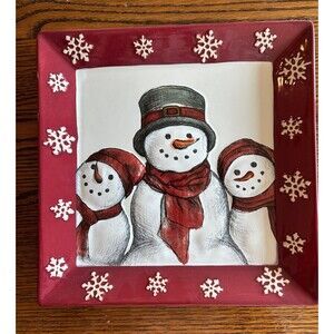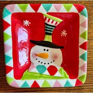 This assortment of 3 Christmas dishes includes a serving tray, candy/treats, and an oven bake dish, all decorated with a festive snowmen and gingerbread men pattern. The dishes are a mix of square and rectangle shapes, with a multicolor glossy finish. Made of ceramic, these decorative items are from various brands like St. Nicholas Square, Pier 1 Imports, and unbranded. The Christmas-themed pieces are perfect for adding a touch of holiday cheer to your dining table or kitchen decor.