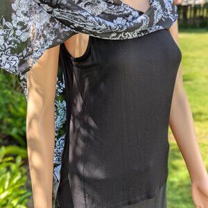 Stretchy black tank top with an assymetrical overlay of white peonies and paisley on sheer black chiffon-like fabric; measures 23 inches long from back of neck to hem, 18-21 inches pit to pit, 17-20 inches at the waist.