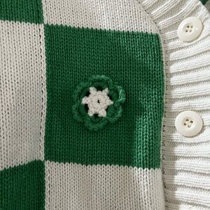 Stylish green and white checkered sweater with floral accents. Perfect for a chic and cozy look.