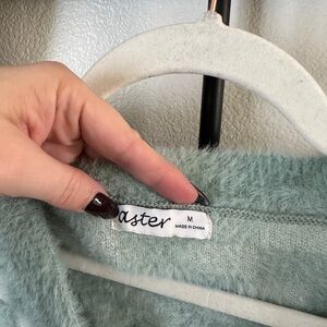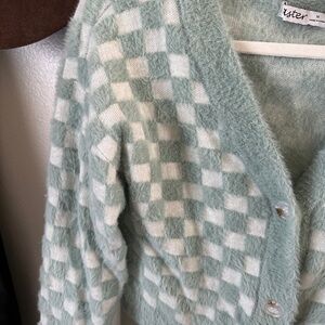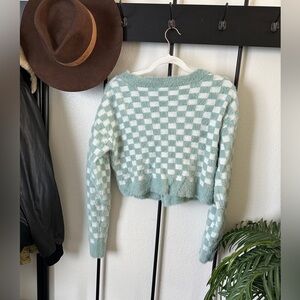 Aster blue pastel checker checkerboard fuzzy knit button cardigan sweater crop