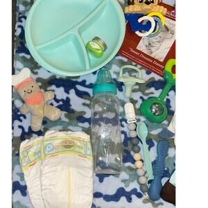 You are purchasing reborn baby boy doll and lots of accessories. This baby boy is an Ashton Drake doll, "Sweet Dreams Danny" designed by Linda Murray. His eyes are closed, his rooted hair is brown. He features soft touch vinyl posable limbs and a weighed cloth body. He is 19" Long and weighs 2.2lb. He arrives home dressed in white sleeper with blue and tan stripes and puppies on the feet and matching hat (Original outfit). He brings the these accessories: A certificate of authenticity, a full size fleece blanket (new), a feeding dish (new), a "Pretend" jar of peas, a spoon (new,) a "chew" spoon (new), a bottle (new), a pacifier (new), a pacifier clip, a Paw Patrol rattle (new), and apple teether/rattle (new), a plush gingerbread man with a teether on top, an extra pair of socks, an extra pirate themed one-piece outfit and 2 extra disposable diapers. Danny is brand new handled only for pictures. He currently lives in non-smoking home.