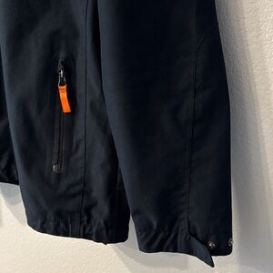 Like new. Navy blue performance fabric with reflective graphics. Excellent quality and details. Watertight welded zippers. Hood folds and zips into collar.