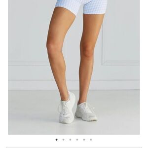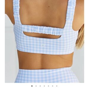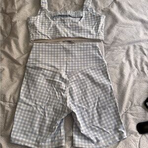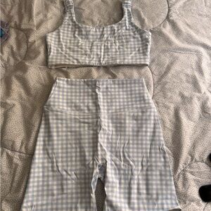 Stylish blue gingham sports bra and shorts set. Perfect for workouts.
