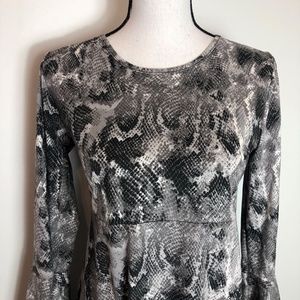 snake skin print tunic with long bell sleeves, measurements pit to pit 14" and back neck to hem 32"