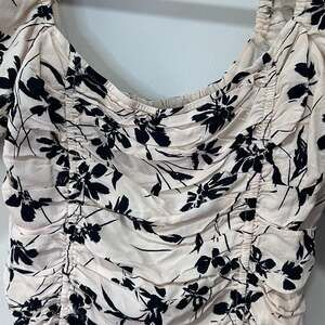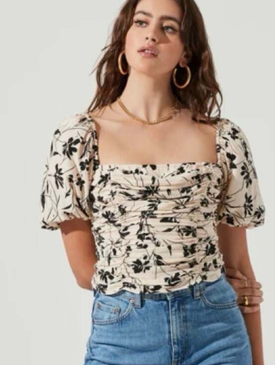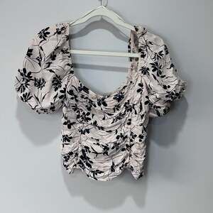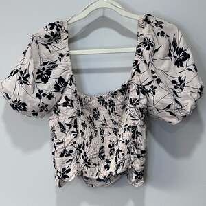 ASTR the Label Floral Ruched Puff Sleeve Top in Black/Cream, Size M. This feminine blouse features a square neckline, trendy puff sleeves, and a flattering ruched bodice. The back is smocked for a comfortable, stretchy fit. Crafted from an eco-friendly EcoVero and viscose blend with a soft polyester lining. Perfect for brunch, dates, or casual outings. Excellent pre-owned condition with no visible flaws. Dry clean only.