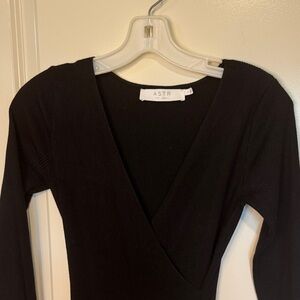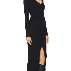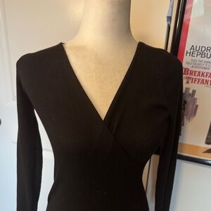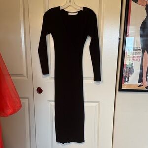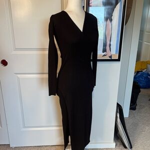 Chic black dress with long sleeves. Features a sleek silhouette. Ideal for elegant occasions. Has side slit no holes no rips from non-smoking home ribbed size small