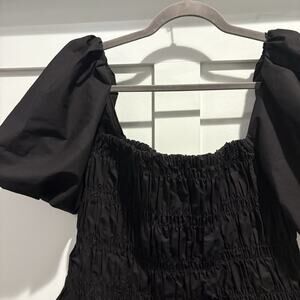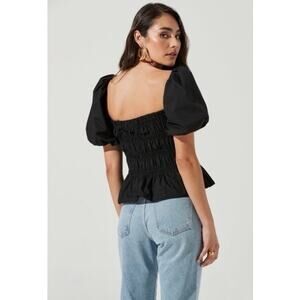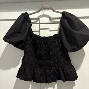 Chic black blouse with puff sleeves. Smocked bodice. Perfect for casual or dressy occasions.