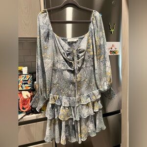 Elegant smocked dress with floral pattern. Features subtle green accents.
