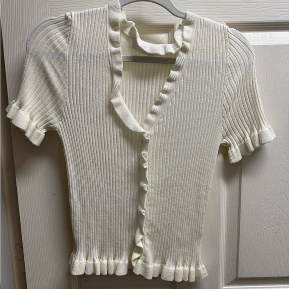 Elegant ribbed blouse. Features ruffled edges. Short sleeves with a V-neckline.